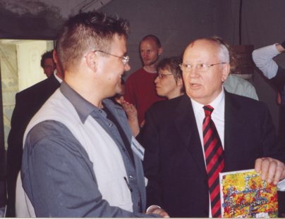 Kurzerhand schnappte ich mir einen Stuhl, hielt mein Bild in der Hand – dabei mochte ich wohl selber wie eine lebende Installation wirken – und wartete. Es verging keine Minute, da öffnete sich die Tür und zwei gutgekleidete Bodyguards mit der Anstecknadel des Berliner Bären (Erkennungssymbol des Personenschutzes der Berliner Polizei) kamen heraus. Es tat sich also was. Den Polizisten folgte ein ganzer Tross von wichtig und offiziell aussehenden Personen. Und tatsächlich, unter ihnen war eindeutig Herr Gorbatschow, der mir nun buchstäblich „in die Arme“ lief. Von Gesprächen mit einem netten älteren Berliner Ehepaar, welches seit fast 25 Jahren als Autogrammjäger auf der Pirsch war und dabei so manchen „Promi“ erwischt hatte, wusste ich, dass es beinahe unmöglich war, an Herrn Gorbatschow direkt heranzukommen. Und mir wurde er nun wie auf dem Präsentierteller gereicht. „Mr. Gorbatschow, I have a present for you“, hörte ich mich wie aus der Ferne zu ihm sagen, während ich ihm mechanisch mein Bild entgegenreichte. Vorher hatte ich mir einige Versionen überlegt, wie ich ihn vielleicht am besten würde ansprechen können, doch mir fiel davon nichts mehr ein. Herr Gorbatschow zögerte - ich wiederholte meinen Satz. Er nahm mein Bild entgegen, musterte es neugierig und sorgfältig. „Glasnost“ stand darauf, wir stellten es gleichzeitig fest. Ich reichte schnell einem der etwas überforderten Sicherheitsleute meine Kamera für ein gemeinsames Foto mit Herrn Gorbatschow. Der aber lehnte ab. „Nein, keine Fotos“. Auf meine erneute Bitte antwortete er „Keine Fotos, ich will nicht fotografiert werden!“ Er hatte wohl etwas missverstanden. Glücklicherweise nahm ein anderer Begleiter in den Sekundenbruchteilen des Geschehens meine Kamera in Empfang. Voller Verlegenheit fiel mir nichts anderes ein, als Herrn Gorbatschow zu wiederholen, dass ich ihm das Bild als persönliches Geschenk überlassen wolle. Er sah mich höflich mit dem Ausdruck seiner Autorität an, reichte mir fest die Hand und sagte: „Strasswudje (oder Strassbudje? – Russischkenner mögen mir bitte verzeihen)“. Noch bevor ich überlegen konnte, was dieses Wort bedeutete, kam auch schon die Antwort seines Dolmetschers von hinten: „Herr Gorbatschow bedankt sich bei Ihnen“. Doch auch ich war von einer tiefen Dankbarkeit erfüllt dafür, dass ich diesem so wunderbaren Menschen habe begegnen können.