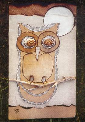 Der Geburtstags-Uhu ist eine Brennrand-Collage, bei der die Einzelteile mit Brennglas, Feuerzeug, Kerze oder dergleichen ausgebrannt wurden.