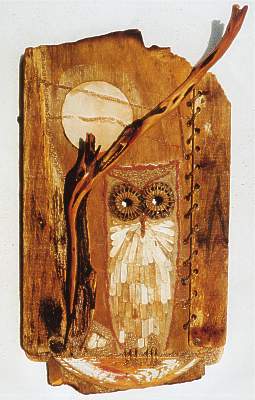 Er entstand aus Strandgut der Peloponnes. Das Gefieder wird durch eine Art Seegras dargestellt. Die Peddigrohr-Ringe für die Augen und das rechte Seitenteil sind mit Paketschnüren eingenäht.