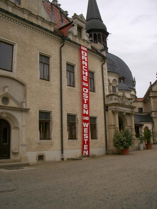 Mit der Fahne "Der Drache des Osten und Westen" geschmückt ist Schloss Schönfeld bereit für den Ausstellungs-Aufbau