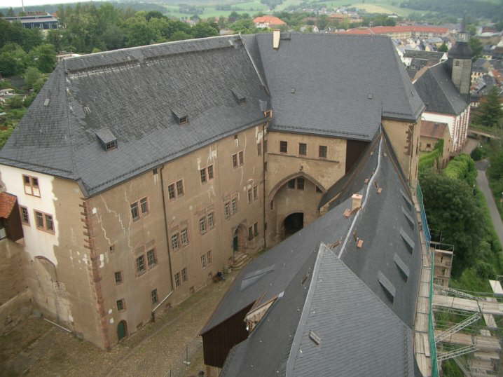 Blick vom Turm in den Innenhof von Schloss Rochlitz