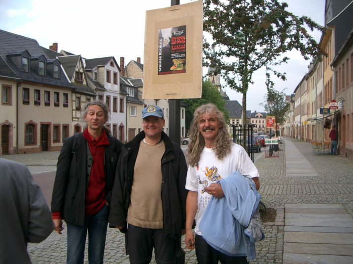 Manfred Schaller, Christophe Didillon und B.J. Antony begutachten die Ankündigungsplakate in der Stadt