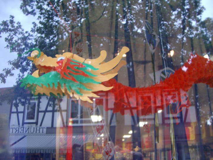 wie ein Luftgeist schwebt der Drache über der Stadt