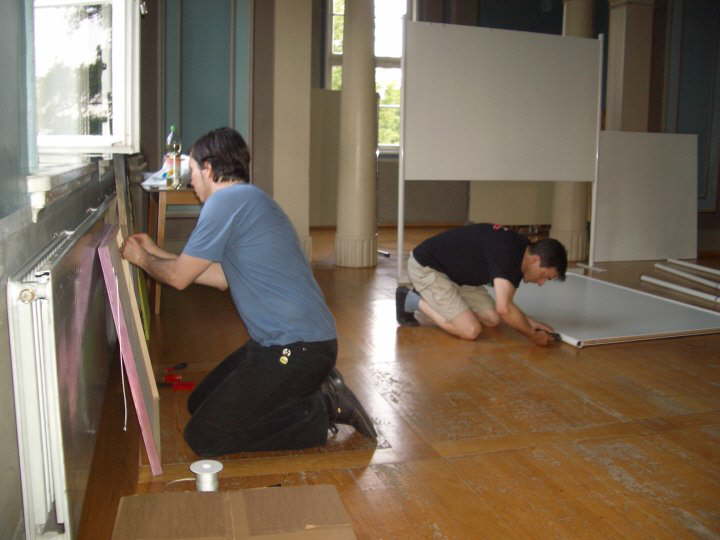 Rayk Amelang und Tobias Heckhausen beim Aufbau in der Schachtruppvilla