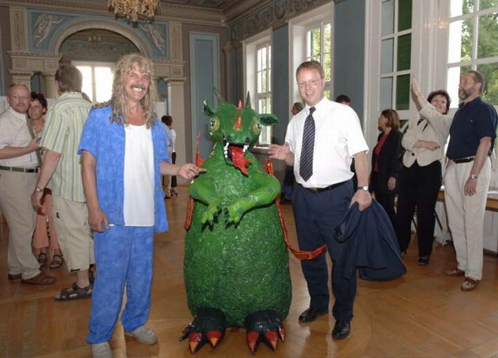 B.J. Antony und Bürgermeister Klaus Becker freunden sich mit Julia Wagners "Anton" (oder ist es "Pünktchen"?) an
